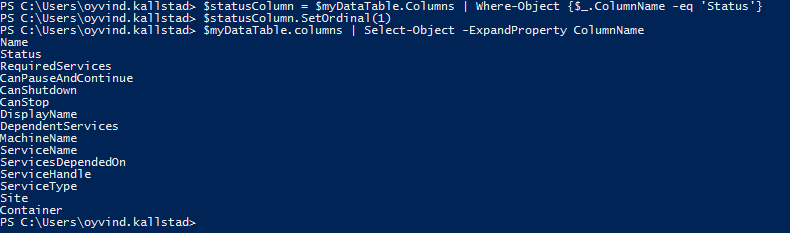 Here we use Get-Service to get an object containing all the services and convert this object to a DataTable. We then get list all the column names.