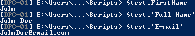 The first two examples you recognize from the object example, but the last two you see the alternate ways of referencing a key in a Hash Table, both of which handles special characters in a more understandable way, as the strings needs to be quoted for these methods to be successful.