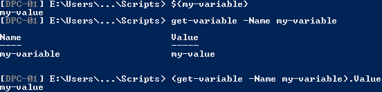 As you see in the screenshot above, the first approach is to wrap the variable name in curly-brackets, and the second approach is to use the Get-Variable command. If you want just the value, enclose the command in parenthesis and reference just the Value property.